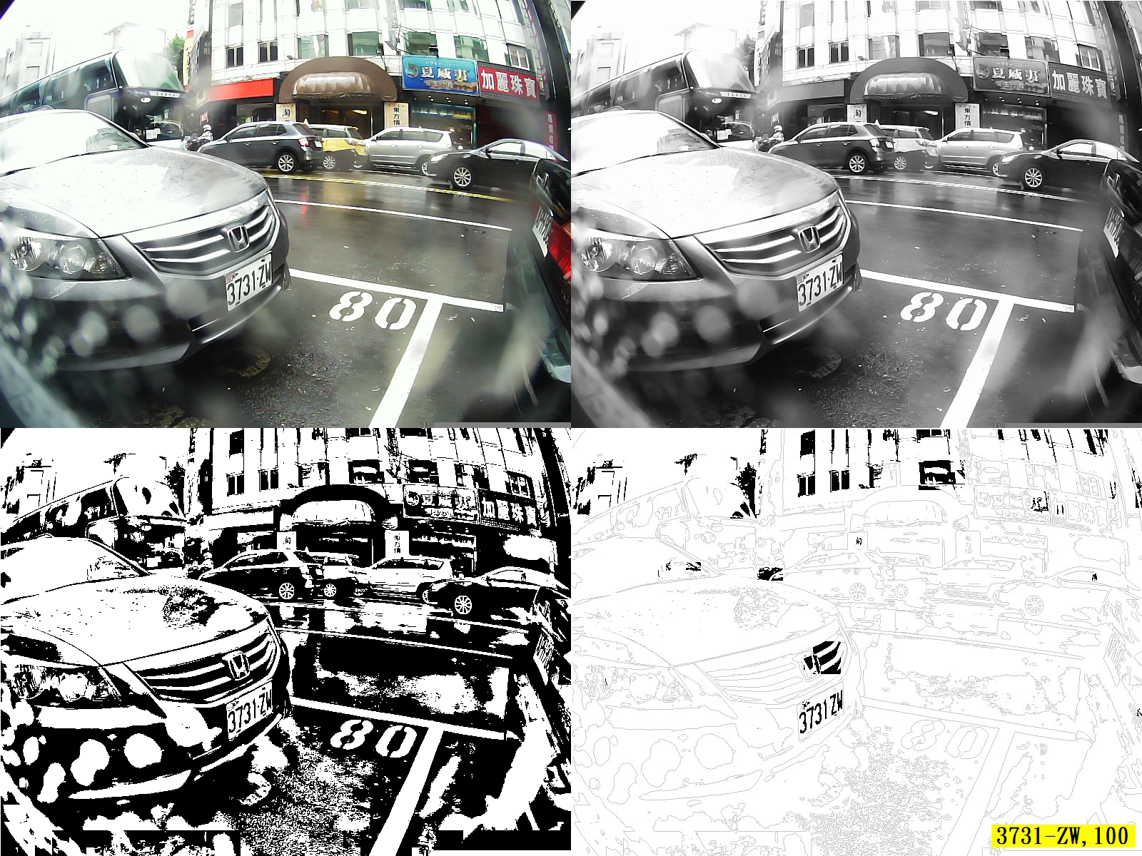上面是我的車牌辨識在複雜的街景中找車牌的四格漫畫,就是標準的OCR辨識的程序:全彩影像→灰階化→二值化→切割目標。可能是車牌字元的目標呈現之後,就是排列組合找到像是車牌的目標群組,開始做後續幾何校正與字模比對的處理了!