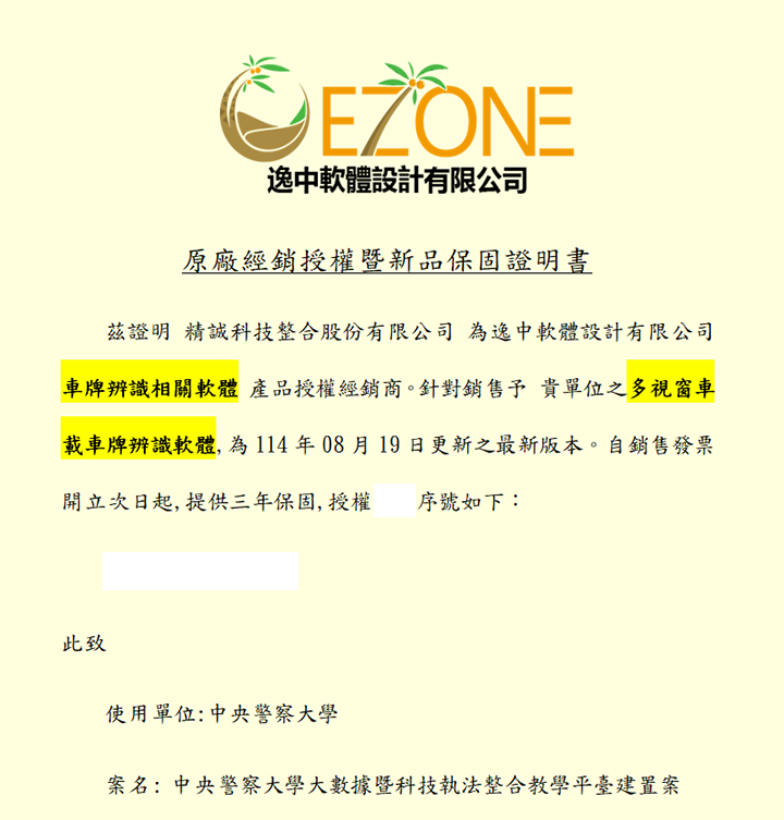 現在客戶常常要我提供這種文件,劇情就是很多公家單位有車牌辨識相關的工程標案,就會有很多系統整合商去競標!他們當然多半沒有自己的車牌辨識技術,就會找某個產品品質較好(或較便宜)的原廠購買核心軟體,來組裝客戶需要的完整系統!畢竟真正優質的車牌辨識軟體很稀有嘛!軟體複製又不必花錢,所以大家都會去買最好的,原廠也可以無限量出貨!