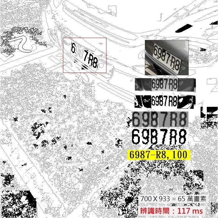 此時在已校正的車牌內,不再拘泥於OCR的限制,用CNN的方式地毯式搜索所有位置的可能字元,因為已擷取的車牌區域很小,不會有CNN耗時太大的缺點,但是之前因為沾連而無法直接用OCR鎖定的字元都會無所遁形了!所以是我替OCR研發的新技術,讓OCR繼續在車牌辨識的領域領先深度學習的!