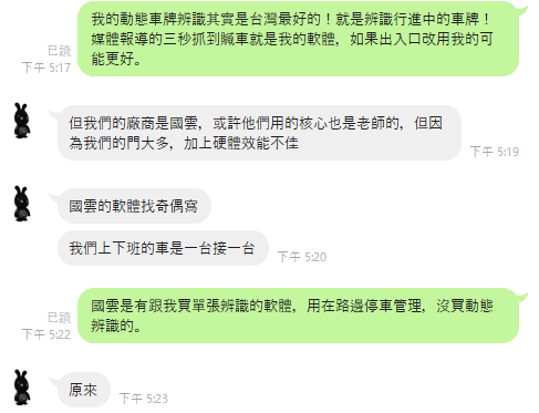 我跟他說絕對不是!因為他們說門口是一台接一台連續辨識,也就是所謂的動態辨識!國雲始終未曾跟我買過這種動態辨識的軟體,我的辨識引擎是完全不適合做連續快速動態辨識的!應該就是如上所說:台元的系統應該是國雲公司與奇偶科技公司合作建置的!