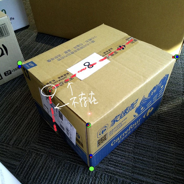這個計畫的目標是在任何狀況下,都能辨識出正確的紙箱長寬高!也就是正確的紙箱邊界與端點!如上的這個案例就可以體會到這個目標的難度!首先紙箱表面就會有很多印刷文字圖案形成雜訊!紙箱外的背景更是甚麼狀況都有可能!綠色較大的圓圈是最接近正確的答案,紅色點則是其他候選人!