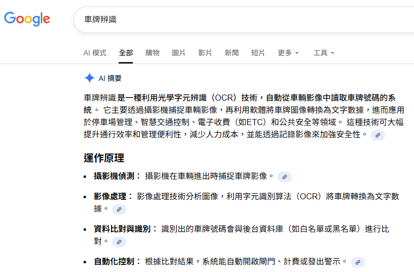 上面是Google的AI對於車牌辨識關鍵字的摘要看法,我覺得很有趣的是:跟我日常似乎有點反主流的言論說法完全一致!我一再強調我的車牌辨識(LPR)產品就是完全以OCR技術為基礎做出來的!也寫了一本相當暢銷的書為證!跟ML、DL與CNN等被刻意炒作的AI影像辨識技術毫無關係!上面的AI摘要居然也完全不見ML、DL與CNN等字眼?他不是很像我的粉絲嗎?
