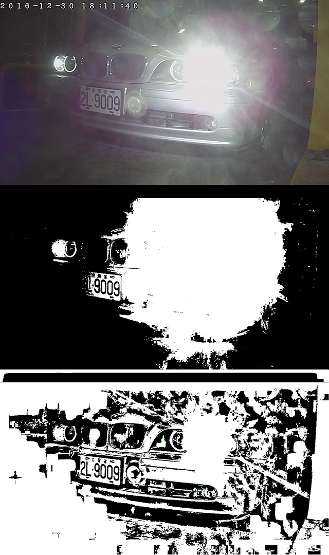 如圖所示,上方是原圖,中間是以單一亮度門檻做的二值化圖,影像處理速度很快,但是永遠找不到可以將所有車牌都同時正確切割的答案!關鍵就是卡在事實上沒有一個「單一」的「最佳」灰階門檻值可以同時適用於車牌左右邊的字!此時你動用機器學習,使用大量資料訓練學習,其實也只是嘗試找出可以正確辨識「最多」個字的二值化門檻,而不是辨識出「所有」字的完美方案!