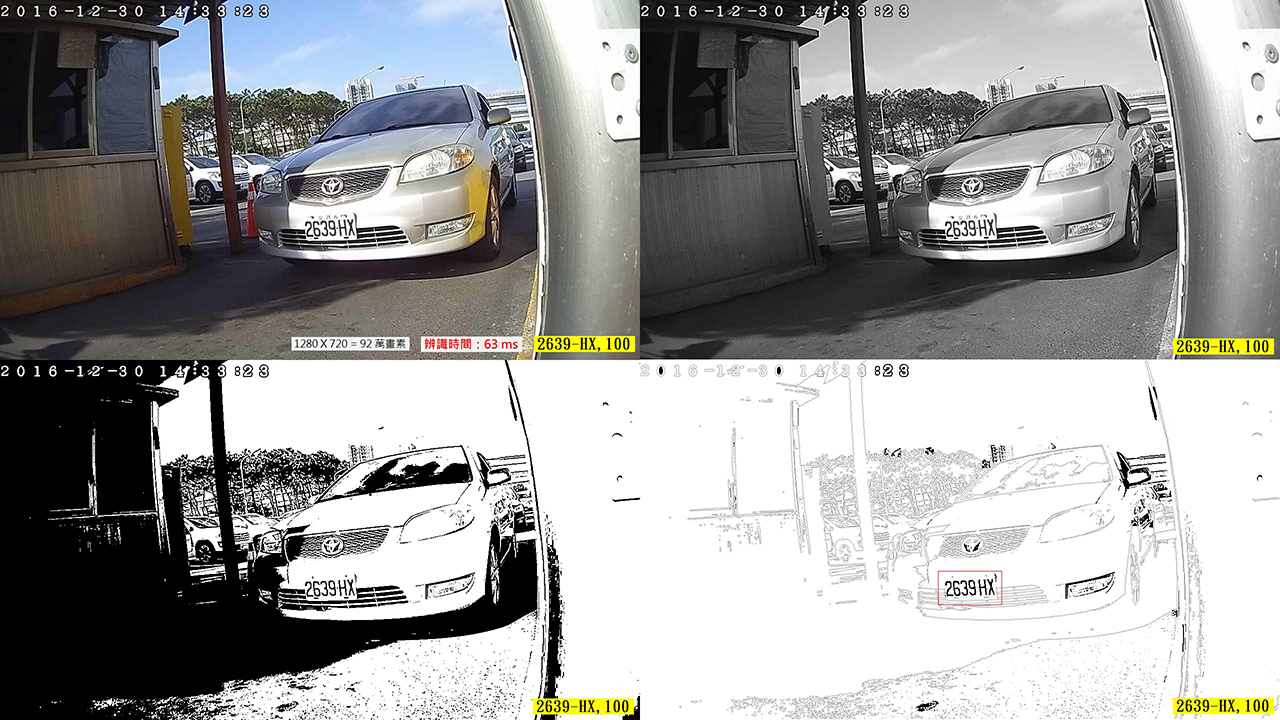 如上圖,這種背景算是有相當複雜度的百萬畫素影像車牌辨識,我就是使用傳統的OCR技術做車牌辨識的!全部程序是:全彩→灰階→二值化→目標切割→目標群組找車牌→車牌影像正規化→辨識車牌。全部完成只需要63毫秒!而且完全不必用到GPU!這就是我的車牌辨識的基本能力!