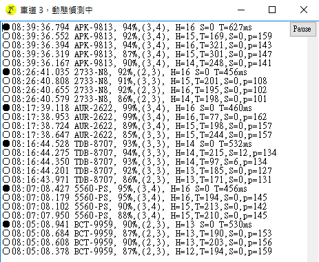 如上就是我的動態車牌辨識軟體的原始資料流的顯示圖!如果合格的辨識結果重複出現達到門檻次數時,那個黑圓圈就是代表確認結果會輸出為正式資料的一筆影像了!這種軟體我已賣出約兩百套了!這麼多地方都持續使用多年沒問題,這位客戶當然不必自己再重複這種研發了!結果當然是很快樂圓滿的!