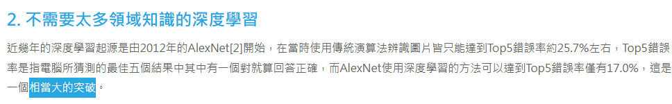 近幾年的深度學習起源是由2012年的AlexNet[2]開始,在當時使用傳統演算法辨識圖片皆只能達到Top5錯誤率約25.7%左右,Top5錯誤率是指電腦所猜測的最佳五個結果中其中有一個對就算回答正確,而AlexNet使用深度學習的方法可以達到Top5錯誤率僅有17.0%,這是一個相當大的突破。