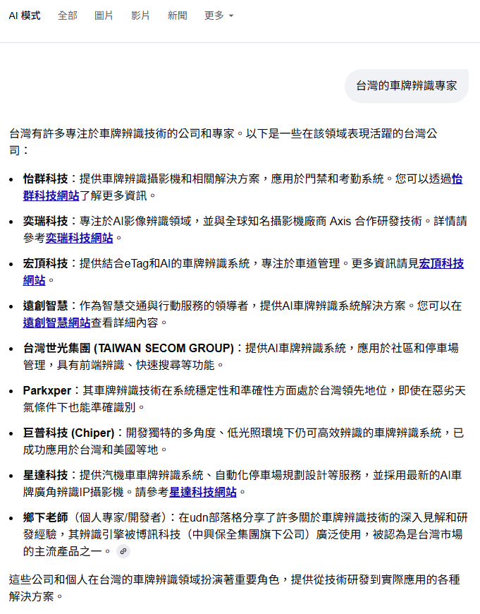 很微妙的?如果我用台灣的車牌辨識專家或廠商這種問題問Google AI,回應的資訊中都不會看到我的公司(逸中軟體)或個人(鄉下老師)的相關資訊?大概只有那些會花錢買搜尋排行榜或打廣告的公司會出現吧?但我的產品銷售量與媒體曝光度不比他們差啊?甚至如中興保全也在榜上,但他們其實是我的客戶啊?買我東西去用的都上榜了!原廠本尊卻看不到?很詭異吧?目前AI的答案是這樣的: