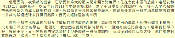 但只是休兵大約兩年後就感覺到身體狀況幾乎是斷崖式的下滑!曾經嘗試去慢跑、游泳、打羽球或桌球,但是都因為不夠好玩難以持續。直到上面標題的這個大事件發生之後,我才正式重回籃球場開啟了這近十年的老人籃球夢!還越打越好,我估計現在64歲的我,一定可以輕易單挑打敗53歲,甚至43歲時的我!
