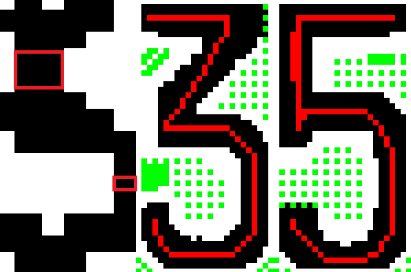 因為我看過很多類似資料,所以不必真的去跑機器學習就可以得到一個特徵了:如上畫的兩個小方框,假的5上面那個垂直筆畫會特別粗!大約是右下方正常的直線筆畫的兩倍粗!根據這個特徵考慮就不會被騙了!兩個垂直筆畫一般粗時就是5,上粗下窄就是3了!