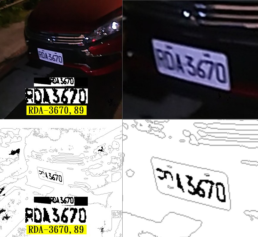 上面就是我們找到這個車牌時第一手的破碎資訊!前兩個字是破碎又沾連的RD上半部,第三個A字也不完整,但是高度大致是對的!367完全連成一氣,0字是唯一清晰可辨認的完整字元!即使資訊如此殘缺,我們還是可以估計出字元的合理寬高,以及整個車牌的扭曲變形程度,先扭正車牌再從扭正的影像中找到每一個殘缺的字元,我的這些推理過程越正確,成功辨識的機率就越高!