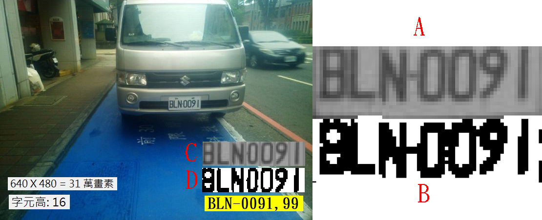 如上圖是個車牌的畫素解析度較低的例子,資料點數資訊不夠就是模糊了!右邊標示的A圖就是抓出車牌位置的影像,並做了幾何修正的放大圖!如果直接用OCR的方式做二值化就會做出類似B圖的結果!幾乎不可能抓到單一的門檻值讓每一個字元都正確的分離!門檻略高就大量沾連,門檻略低就會支離破碎!