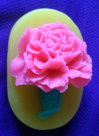 本產品康乃馨花朵,研發開模,是高難度挑戰!本皂製程較一般手工皂複雜,必須等待三個時段, 自然粘著不脫落,所費的時間,是一般製程的三倍時間。