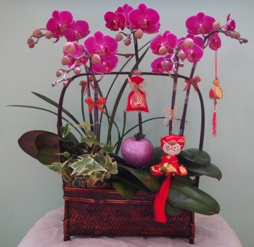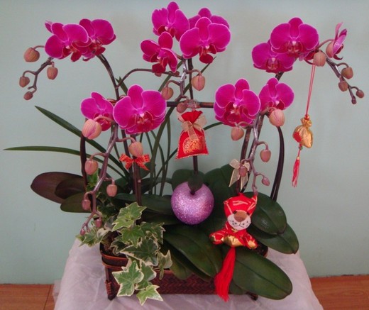 搭配四個小蝴蝶結(虎年事事如意)/一棵小觀葉植物(長春藤)/高貴國蘭