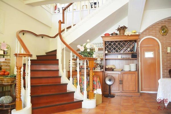 ↓餐廳內典雅的木櫃、迴旋梯和擺飾等,散發歐洲居家氣息。