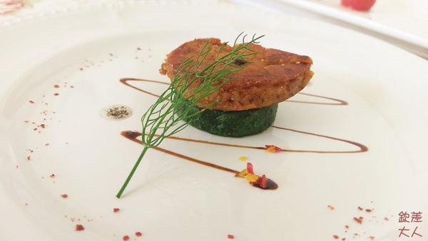 ↓主廚蔬肝醬佐香煎時蔬,蘑菇和蔬菜烤乾打成泥拌起士煎熟,淋上松露醬香氣四溢。