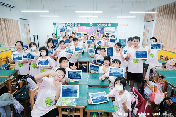 南陽國小學生玩光影藍曬。