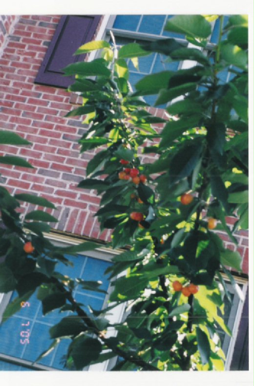 樹長得醜,就不想多瞧,前院的垂櫻我是視而不見,竟不知它開完花還真的「結果」了。那天幾個太太到家裡喝茶,走到前院,只聽一陣驚呼:「欸!妳幾時種了櫻桃呀?」我抬頭一看,呵!真不是蓋的,「龐克頭」上不知何時竟結了纍纍櫻桃,而且跟店裡賣的赭紅色櫻桃一般大小;但顏色是粉紅的。