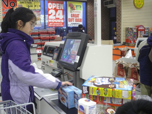 給「金芭莉」﹕呵,真的,有不少老美就是和妳一樣,不想面對一台冷冰冰的機器,所以寧願花時間排隊,走有收銀員的line。