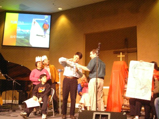 用過餐後,大家進入大堂坐好,「好戲」正式上場!五個查經班(註一)輪番上台表演精彩節目,有人唱歌、有人演戲 (註二),好不熱鬧!