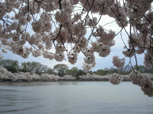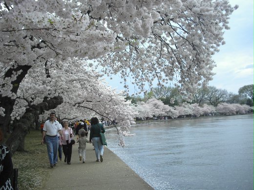 四月一日適逢周末,天氣非常乾爽舒適,外子決定開車進 DC 。果如所料,原本只要二十到三十分鐘的車程,因賞花車潮,塞了一個多小時才進入DC。好不容易找到停車位,我們隨即沿著特區內的潮汐湖( Tidal Basin )畔步道漫步,幾千株粉白似雪、如夢似幻的櫻花環繞著偌大的湖,連綿好幾英里。