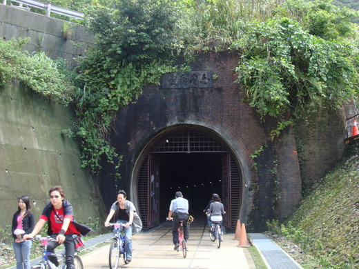 三方會合的自車行道。貢寮自行車道連通舊草嶺隧道、福隆海濱公園及鹽寮海濱公園,十之八九的腳踏車都是朝舊草嶺隧道逍遙遊。在隧道裡騎車,清風徐來,間有隆隆火車汽笛聲及丟丟咚的歌謠,輕輕鬆鬆從北口的「制天險」(或成天險)騎到南口的「國雲飛處」(或白雲飛處),
