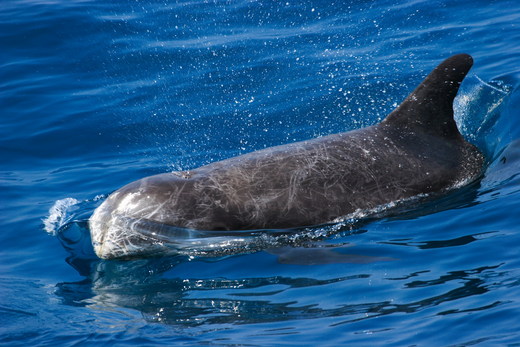 至於花蓮海域較常看見的花紋海豚(瑞氏海豚,台灣亦有人稱為和尚鯨),則是個優雅的大老。圓圓的頭、鐮刀狀的背鰭、花白般的刮痕線條,靜如處子的個性,偶然也有動如脫兔的時候,來個華麗的炫耀--側邊連三翻。花紋海豚年少時膚色是黑色,隨著捕獲與打架次數的增加,傷口會結成白色的花紋,花白紋是牠們的戰功勳章,每一次跳躍都是展示顯赫經歷的好機會。喜歡與其他鯨豚混群出現,或許在混群中畫圈圈有著「單圈兒是我,雙圈兒是你。整圈兒是團圓,破圈兒是別離」的況味。