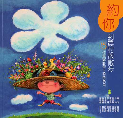 首先,封面出現饒富童趣的畫風,小男孩戴著斗笠,帽子上面是農舍、鴨子和蔬果花卉等農作,上頭書寫著「一朵像花的雲,一直跟著我」,畫家幾米以隱藏版畫家的身分,帶領讀者驚豔農村的情與美。