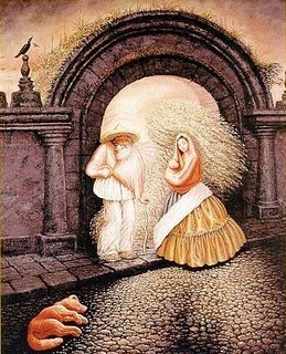 辦公室的字戀園地貼著一張Randy Glasbergen公司製作的人像圖,乍看以為是位拄著拐杖的老翁行經柏油路面,與少婦不期而遇,一旁的小狗正悠閒地小憩。但隨著焦距的轉移,童山濯濯的黃髮鮐背於焉出現,小狗旋即成為他那略帶畸形的手。