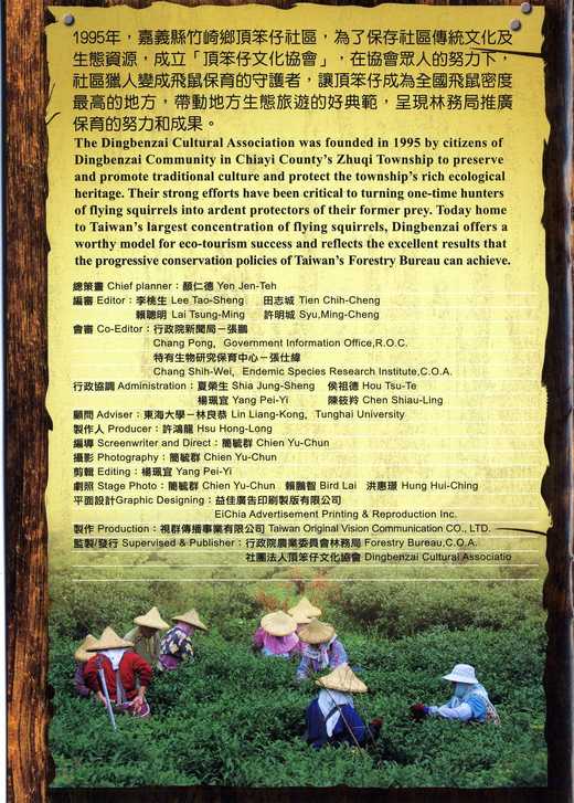 最後,影片還記錄台師大學生林致綱觀察大赤鼯鼠的研究心得,並與社區民眾交換巢箱使用經驗,最特別的是,在頂笨仔還意外地發現小鼯鼠的巢洞,也許透過保育理念的推廣,更多的鼯鼠習性將不斷地呈現,「鼯鼠五技而窮」的說法將會一個個被推翻,賦予新的科學觀點。