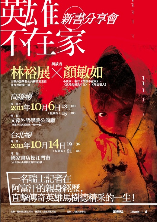 繼「此時此刻我不在」、「拜訪壞人」後,顏敏如再推長篇小說「英雄不在家」,描述阿富汗已故軍事領袖馬樹德(Ahmad Shah Massoud)的傳奇一生,並加入瑞士記者索格(Eugen Sorg)部分親身經歷。