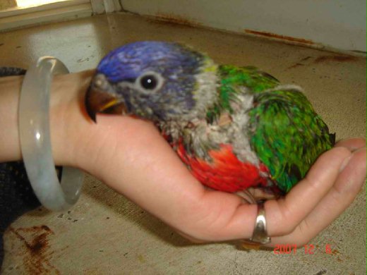 12/05 經過第一次餵食之後,牠就視我如親娘也不會啄我了, 還喜歡磨蹭我的手, 聽見我叫《彩虹》還會循著聲音找我。