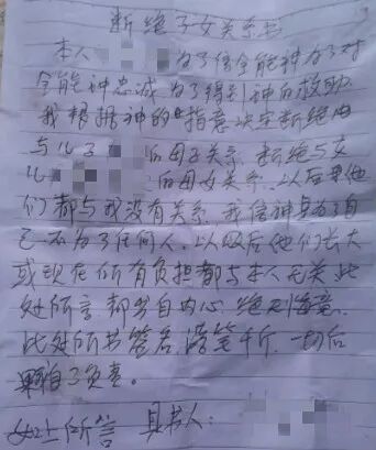 ▲某“全能神”信徒写下的断绝子女关系书