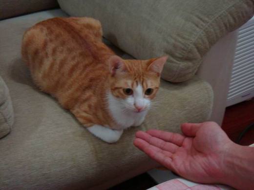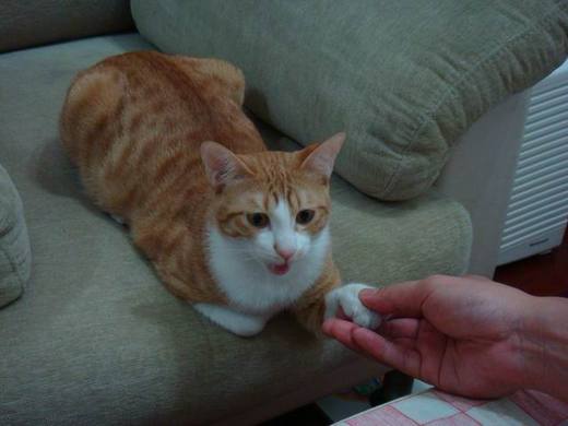 工程師很得意教會橘子握手,一天要纏著橘子握手好多次,而且並不一定每次都有小魚乾,橘子很無可奈何,每次都被迫要配合工程師握個不停的手。