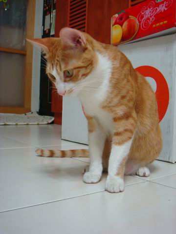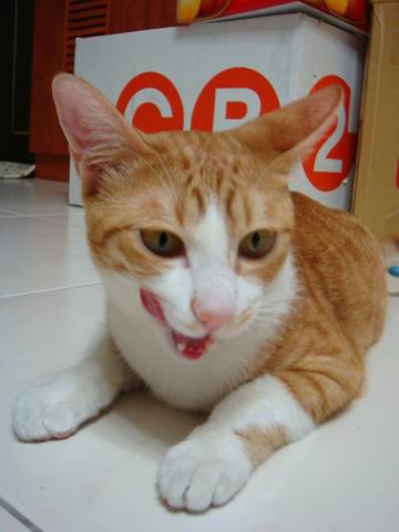 工程師幫橘子種了貓薄荷,每隔一兩天就會給橘子吃一片,橘子對貓薄荷的味道很敏感,一瞬間聞到會往後跳一大步,然後又緊緊盯著這一片綠綠,用手試探性的摸摸,再跳開,再慢慢趨近,伸出手撥近,伸出舌頭捲進嘴裡,咬一口、吐出來,再盯著看,終於整片葉子吞下去。下一次再遇到貓薄荷,相同的反應又會再來一遍......