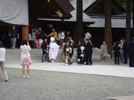 在北海道神宮遇到婚禮的舉行,因為是「神宮」地區,所以雖然是喜事,大家臉上是笑嘻嘻的沒錯,不過現場既沒有人大聲招呼,也沒有人高歌慶祝,喜家的親朋和剛好路過的旅人都很安靜的興奮著,一點也不喧鬧。