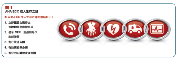 依據美國心臟學會(AHA)2010年公告的急救方式,在猝死的成人急救時,生存之鍊