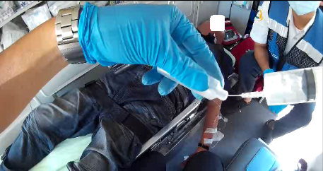 圖二.筆者在救護車上為患者執行靜脈輸液及葡萄糖水注射