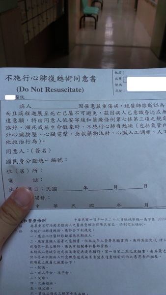 給我這一張紙,在人短短的昏迷兩三個小時後,學姐希望我跟家屬聊一聊這件事,