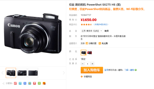 佳能 SX275 HS 苏宁易购售价:1650元>>点击购买