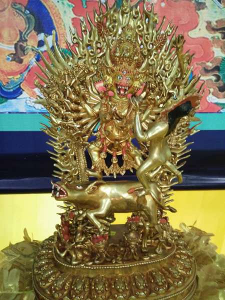 此法在世面上是較少有,因為一般法會只做到大威德金剛,而大威德金剛降焰魔尊嘿嚕嘎,是屬於無上密瑜伽,那麼在無上密瑜伽部的裡面,本尊共分為兩類,一者稱為寂靜相或是文相,為善良靜雅的佛、也就是慈悲菩薩的形象,這在理論上被認為行者自心本具慈悲智慧之性,我們本身就擁有菩薩的慈悲心,只是因為在娑婆世界中,我們輪迴太久了,沾染了習性無明,所以就忽略了我們本來具有的智慧與慈悲,所以行者要修極忿尊之前,一定要先修慈悲本尊,不是說我們今天知道怎麼修法,我們知道護法的力量強大,動不動就要修法降伏他人,如果你今天沒有慈悲性,力道拿捏不準,對方可能下樓梯,一跌倒,脖子就歪了,喝個水就嗆到了;再來第二類著稱為忿怒相或是武相,此為猙獰兇惡的金剛相。而這在密乘佛教及藏傳各教主要觀修的這類忿怒相中的本尊,大都是以上樂金剛、喜金剛、大幻化網金剛、大威德金剛、時輪金剛等“五大金剛”為主要的金剛法,這也是藏密四大教所共同推崇的主要金剛法。而寂靜、忿怒兩種本尊形相,及其所執的器杖等,全都是以象徵的方式來表示智慧、方便教理。如本尊坐蓮花日月輪座,上有一屍體,並以骷髏為花冠瓔珞,此乃表示生死即涅槃之義諦;若以毒蛇為飾,及青面忿怒獠牙的兇惡相,即表示降伏煩惱,化嗔惡為菩提;本尊許多手臂,表示『方便』用來教化眾生的善巧法門;以及男女雙身像,表示空有悲智為道…..等等。很多人都把密教的法相,用自己的眾生智,也就是你看到什麼,就主觀認為或認定,以自己狹義的智慧跟習性無明,來指點來指責,啊密宗的法相就是這樣,那是歡喜佛,你們大家不也都是歡喜佛嗎?每天關起門來,這個沒有什麼,這個就是方便,天地之間,萬法都是唯心,法無定法,好比你現在手中拿了一支槍,或一把刀,就看你怎麼使用它,而不是用它來造惡,一把刀在屠夫的手上,他會殺雞宰羊殺牛殺豬,如果這把刀在醫生的手裏,他就可以幫病患切除腫瘤,可以醫無數人的性命,同樣都是一把刀,這個就是取決於行者在當下,你的心念是在什麼樣的境界中,所以密教的行者大都是要以慈悲為主,修慈悲尊為主,你可以修護法,但是把你的憤怒轉為護法的憤怒心,像慈母在教育子女,像師長在教育學生,基本上,你是以愛心為出發點,就像師姊在教老公一樣,雖然是河東獅吼,但是那也是為了老公好,對不對?所以說出發點很重要!