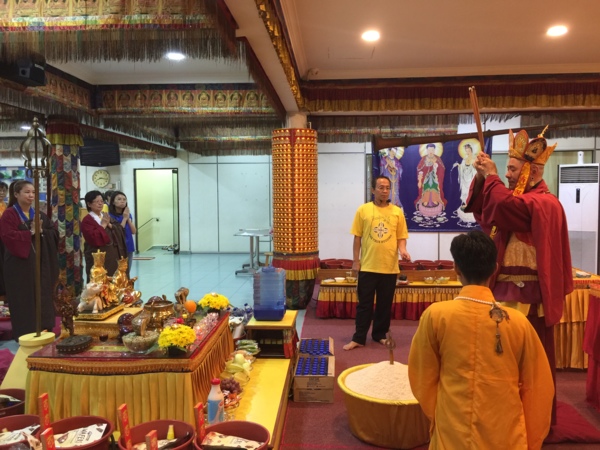 真佛宗大圓滿傳承弟子蓮花釋樂智今代師依聖言教說法,其實剛剛我要講的,蓮杏法師已經講一半了,那剩下的我們就嗡部林就好了(眾人大笑),謝謝義工同門,你們每次在法會中默默的付出,法會之前,你們總是比人家早到,法會之後,總是比人家晚走,真的感恩你們,有你們真好,謝謝(眾人熱烈鼓掌),昨晚法會有略為大家講解道教的普渡過程,那麼現在為大家略為介紹道教的太乙救苦天尊!太乙救苦天尊,是道教專責救度亡魂的大神,其實也是大菩薩,祂的名目繁多,如:《太乙救苦天尊說拔度血湖寶懺》、《靈寶煉度》、《太乙救苦天尊接引浮生法事》、《九幽燈儀》等等。那麼以《太乙救苦天尊接引浮生法事》為例:首先,由一道長扮演太乙救苦天尊,端坐高臺正中。諸道士扮演眾仙弟子,立於兩側。像道家在法會前,會有一些扮仙的儀式,天尊(道長飾)用團扇扇三下,以寶劍或鐵拐杖、玉如意等法器敲三下,意為天尊滅地獄之火,以法器打開地獄之門,引鬼魂出離地獄,後開始為眾仙、地獄鬼眾與悠遊人世之亡靈講經說法,天尊說法畢,遣眾仙跳下虛空,飾演的道士們各持法器,跳下高臺滿場跳躍,意是拯救四方鬼魂與信徒之祖先。這如果在我們的超度法事,就叫走赦馬(台語),為亡靈拜懺祈福,那跳下高臺滿場跳躍,意是拯救四方鬼魂與信徒之祖先。所以為什麼我們在做羅天大醮的時候,會有很多人扮鬼王辦大士爺,就是這樣,有的更慎重的還要畫臉,譬如八家將、遊神、將官首,包括鍾馗大師,但是要記住,被挑出來畫臉的是很重要的,第一,你要茹素至少七天,有的要四十九天,還有不能亂講話,要禁口,畫了臉以後,最忌諱講話,那時候你跟神沒有兩樣,有的人開玩笑,回去就慘了,所以在扮這個臉的時候,要很慎重!那個人都是要挑的,但是很多人不了解,覺得好玩嘛,穿上去就開始聊天,我告訴你,哪個都很慘,道家在人世間,從九天玄女下凡塵,最少都超過七千年以上,後來才有佛教,其實佛教在之前就有,只是大家比較認識佛教是從釋迦牟尼佛開始,二千六百年,大家只記得釋迦牟尼佛而已。好言歸正傳,此時天尊並用柳枝或桃枝等,蘸金瓶中的甘露法水灑下,也有改為丟擲糖、餅,供信徒拾取,代表著施食餓鬼眾並超度其出離地獄。