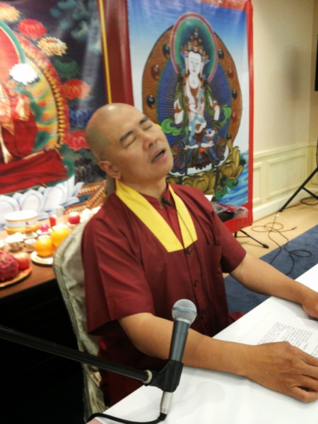 那麼,今天你活著就會快樂,你們只要能活得長壽些,就要多做一些有益世間事,弘揚真佛密法,我們行者不管修任何一種法門,均要有恆心,不要想到修一日,停三日,最少要一日一修,你沒有一日一修,你也要憶念你的根本上師,三根本住頂放光加持,給我們自受灌頂,這個是最基本的,那麼你今天修法,在夢境當中,夢到自己災難來了,你要趕快修還淨法,修上師金剛薩埵還淨法,趕快修息災法,要修到有了吉祥夢兆,只要你努力修,可能一百壇啊,你就會有很大的感應,兩百壇,三百壇,四百壇,你依照這個法修,你一定會有很大的感應,很大的覺受,你會了解你修這個法,你今天能夠得到這個法,當你業障消了,光明顯現,你會感恩啊,那如果你了解以後,你也會痛哭流涕啊!為什麼?因為,你們會覺得自己太晚得到這個法了,如果能早點遇到早點修,那該多好呀;所以大家不要錯失良機,這個機會不常有啊,師尊11月16號回來,再來台灣就會有法會,你們可以開始安排啊,這中間要參加師尊法會之前想一下,多待個幾天,提早連絡,趕快來請法,好好的為自己求為自己修,那個都是你自己得,沒有人可以搶得走的,這個是非常重要的。那我們要延壽除了修法,除此之外,還可以做很多事情,比如說,可以修橋鋪路,就是利益眾生的事,修建佛寺、閉關中心,或是世明要找地方要建,大家都可以來護持,這個就是發菩提心,幫助上師修行功德無量啊,所以你看他這些年來都如如不動,因為他已經成就了,等待你們大家來護持,再來就是造佛像,佛堂需要莊嚴的金身度眾生啊,越莊嚴越好啊,這時候你有一尊力量就供一尊,有兩尊的力量就供兩尊,如果你有大大的力量,當然根本上師的金身好好的做一尊,供在主殿,這個就是你的心,這個也能夠幫助自己延壽消災的,再來就是做擦擦,擦擦是小佛像,有時候你可以做很多小佛像跟大家結緣,像我們做地藏王菩薩,我們可以集資,一個人做個四、五十尊,或二、三十尊都可以,法會期間跟大家結緣,讓地藏王菩薩去度這些眾生,這個也是菩提心的一種,消災的一種,我記得我們台灣有一個影星邰智源,他家裡長輩往生時,他就印了師尊的善書,也購買師尊的文集,最主要祂也是請我幫他做地藏王菩薩的金身幾百尊,在長輩出殯那一天,有很多親友來,邰智源就請地藏菩薩和師尊的文集,跟人家結緣,還有法會也跟人家結緣,所以,往生的大德因為這個功德力而超生,這個不是嘴巴講講,而是實際去做,這個就是利益眾生,你又可以達到孝心,所以我們做法會也是一樣,可以廣行佈施供養,可以向壇城諸尊供養食子。這是一般顯宗、顯法常用的方式。