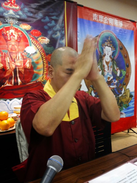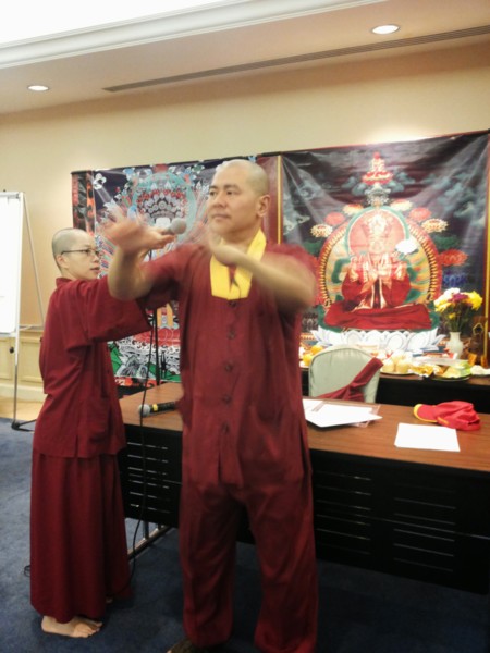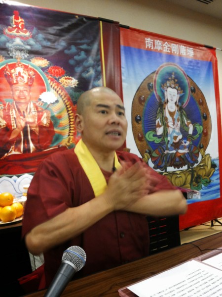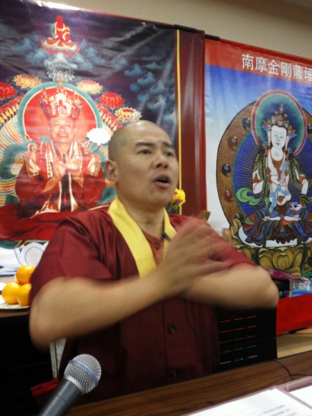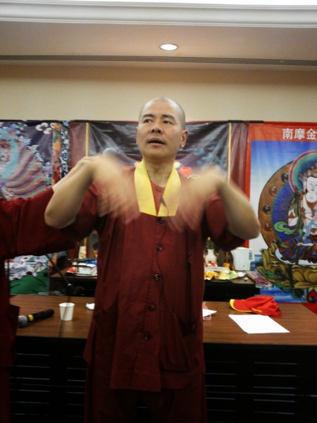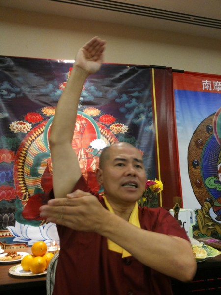 最後就是如果你的命根氣有問題時,須練金剛拳瑜珈體功法第一式「飲空續命」法!看起來沒有什麼,我這講課好像沒有什麼,但是裡面都是有功法,裡面都有觀修的口訣,光是我剛剛示範拍打,修完法你拍打,再來你的呼吸法,還有要怎麼去散,抖動力法,這些都是幫我們身體健康的,這樣你在修行裡面,你會越修越有精神,越修越健康,像師尊為什麼每天打金剛拳就是這樣,拍拍手,師尊打金剛拳很棒,好像很好喔,裡面都是有功法的,不是隨便比一比的,你要配合呼吸,這個呼吸法是要長時間訓練的,早上五點就要起來面向東方練氣,開始修飲空續命,日出東方,東方不敗,我就是東方不敗啦,任我行(眾人鼓掌),要學會方法,你依照真佛密法,它的功法、技法,瑜珈體功,配合呼吸法,細慢長,那麼呼吸法本身又分為均息和射息,那麼什麼時候可以用到射息?這個是到很高的高山啊,海拔很高的地方,天氣很冷啊,你必須要快速的,利用呼吸法,使身體產生熱能,這時候你就必須用到射息,但是射息如果你不懂得運用,沒有基礎,你容易短壽,因為呼吸太快了,你必須先築基一段時間,你已經懂得呼吸法了,你脈有通了,你就可以用射息,讓自己身體快速產生熱能,其實功法是很多啦,但是方法要正確,那麼最主要是來自上師傳承的灌頂,你們今天聽到這堂課,算是你們很有福氣(眾人鼓掌)。其實這裡面都還是有不共口訣秘密心要!現在教導大家做六姿體功法,時間真的不夠用啊,要講課嘛就要好好的把它講完,不然怕大家聽了,有點意猶未盡,講課是要很長的時間,這個都是一種經驗跟累積,你要先有了概念,你才有辦法去修習,這個是非常重要的!「當『氣』入於『中脈』之時,其覺受,整個心是麻酥酥的,由於專注於這種覺受,這種殊勝的法味,於是,心就住了。」這是我個人的經驗,所以我時常有提到,這細胞會跳舞,就是你做「寶瓶氣」時,氣入中脈,氣在中脈裡面稍微摩擦一下,就會產生一種從來沒有的一種滋味,是你絕對說不出來的那一種快樂,是沒辦法形容的快樂,我們稱這種樂叫做「大樂」,是真正的大樂。