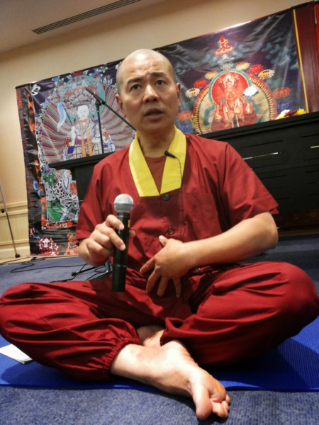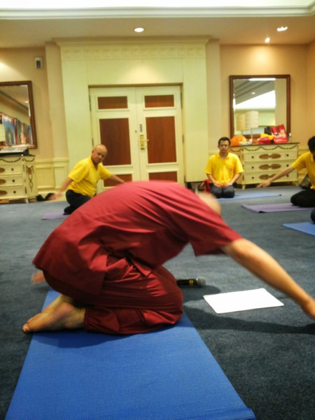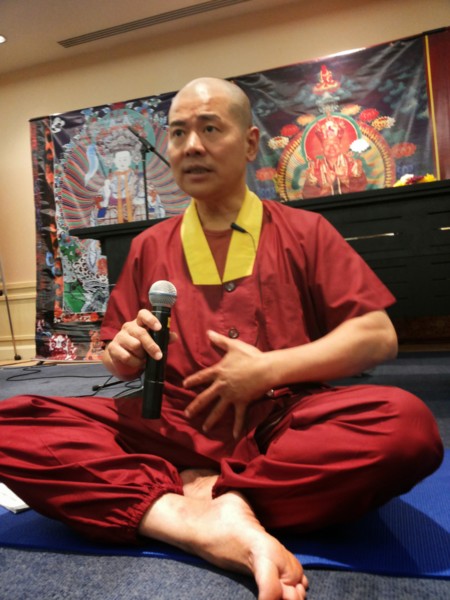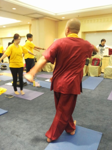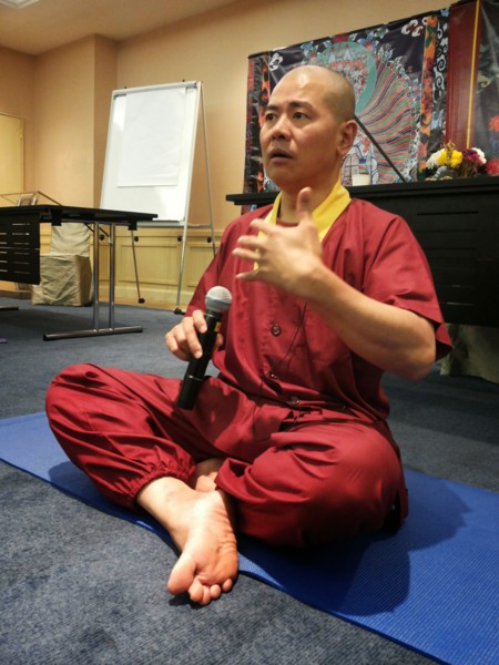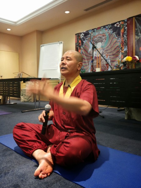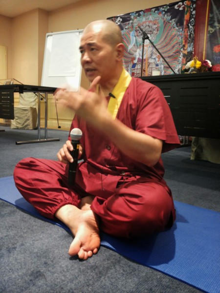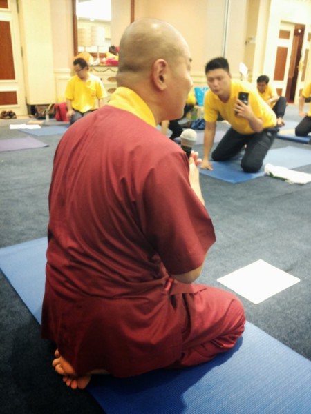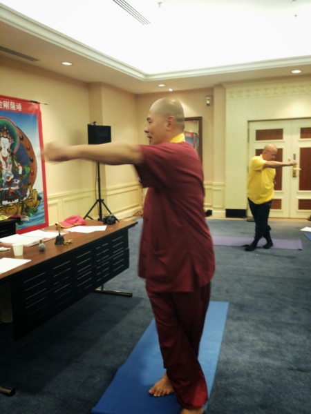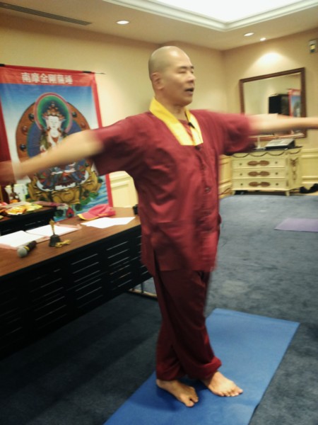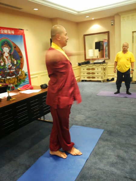 那麼第三式,就得要示範了,不能只講了,你們剛開始,輕鬆的坐久可以了,動作有做到就可以了,那慢慢的你再調整你的身體姿勢,譬如說,你要單盤或是你要雙盤,這時候才慢慢來,你也可以用跪姿,順便拉腳筋,就看個人,你如果覺得不好坐,你就把筋骨放鬆,怎麼坐都可以,隨意坐,最主要是在動作,你呼吸調勻以後,一樣是提肛憋氣,這時候你就要按下去起來,臉看後面,按下去起來,頭住後面看,這個都是擠壓臍輪的方法,就是你的呼吸調勻以後,腰部以下不動,以臍輪為軸心,身子向右雙手打開,身體與雙手同時向下壓,眼睛看後面,雙手掌同時著地,然後身體再向左旋轉,雙手同時向下壓,眼睛看後面,同樣動作左右重複數次。但是起來身體一定要直,直以後才轉身下壓,起來以後要直,才轉身下壓,一定要用這樣的方法,反覆的做,到你不能憋氣的時候,才把氣吐出去,那再將呼吸調勻的時候,等氣吸飽滿憋氣後才開始下壓,這時你要動作越來越快速,練呼吸法一定要提肛,因為你練的是瓶氣,你是把氣擠壓以後,讓氣比較容易進入中脈,所以你自己呼吸調勻以後才開始做動作,吸氣後憋氣,舌抵上顎然後快速這樣做,這最主要是要讓你的氣在身體裡面反覆的做擠壓的動作!那這樣,第三式你們懂了嗎,有沒有記起來,如果說頭會暈是因為你的氣沒有憋好,氣不足身體弱,其實我們本身來講,每一個動作,你的呼吸慢慢的調,調到均勻以後,飽的時候提肛,舌抵上顎壓喉結,你才做下一個動作,因為你的氣要存想到丹田啊,不是這樣(上師示範胸式呼吸),吐氣的時候,你的肚子是要向內縮的,氣完全乾淨的,腹貼背啊,那麼你吸氣的時候,你的肚子是會拱起來的,完全是在這個地方用力(丹田),你所有的呼吸都是在丹田的地方,吐跟吸完全都是在丹田,這時候就是呼吸調勻吐氣,吐到乾淨了,氣一吸肚子鼓起來,氣是在這個地方的,它是非常的堅硬,完全是在你的丹田,這時候你一樣是提肛,舌抵上顎,你才開始做擠壓的動作,為什麼要這樣做,第一,這樣你的氣才能夠擠入中脈,藉由這個擠壓的力量,氣才能夠進入中脈,不然你氣怎麼擠入中脈?氣會散掉的,所以口你把它封住,肛門把它塞住,提住了,全身都充滿氣了,你全身是堅硬的,肚子是硬的,這時候你才開始做瑜珈的動作,你能夠做多少次,你就儘量做唄,氣憋不住的時候,你才開始把氣慢慢的吐出去,你可以用嘴巴吐沒關係,但是記住喔,今天送大家千金口訣,也就是你們最後要留一口氣,不要全部吐出;當氣快沒時,再馬上吸氣,肚子再趕快給它吸滿氣,吸滿肚子鼓起以後要趕快提肛,舌抵上顎,然後繼續做,同樣的動作,反覆的作,久而久之,你的氣就會非常足,那麼氣入中脈就不是問題了,這個就是臍輪擠壓的功法!全部都是在講臍輪,因為臍輪不通啊,其它就很困難了。