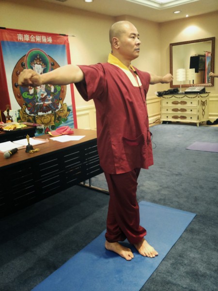 還有,我們在訓練呼吸法時,重點,一定要氣入丹田,這時不要用胸式呼吸,這樣憋氣臉容易漲紅,所以你平時就要訓練腹部呼吸,練腹式呼吸,氣要能入丹田,讓身體習慣,因為你在練瓶氣時,也是要用到丹田呼吸,因為有的人的習慣是用胸式呼吸,但是胸式呼吸不能耐久,你要讓氣它慢慢的習慣丹田式呼吸,就是你呼吸時,肚子會拱起來,吐氣它會縮進去,像我的呼吸都是用丹田式呼吸,已經習慣了,平時呼吸都是肚子,丹田的地方在用力,那一般人大都是用胸式呼吸比較多,其實這個是可以調的,你慢慢的把它調整過來就好了!所以你們試試看,這樣,大家習慣了嗎?了解了嗎?有沒有不記得的,要不要自己再做一次看看,趁你們大家記憶都還在的時候,做一次完整的,你就知道第一式就是這樣,那第一式就通關了。不要做了回去後,好像是又好像不是!這個就是抖動力法,利用震動的力量,來幫助自己開臍輪,所以你做了這個動作後,你要記住這些動作,平時每天都要訓練,這對身體是有幫助的,都要訓練一下,剛開始做的時候,會比較累,久了就好了!