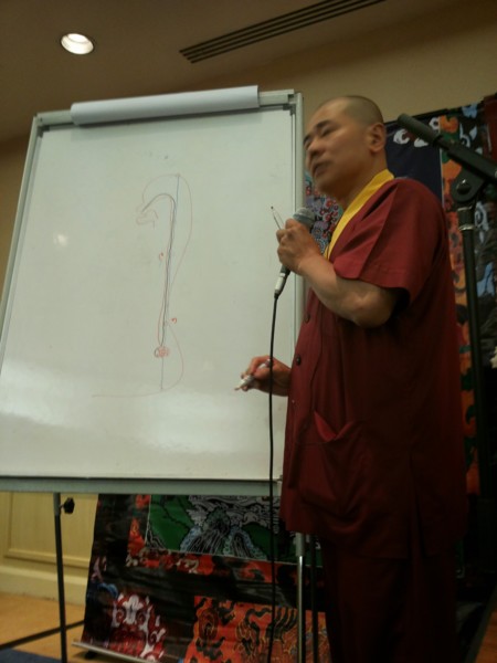 當氣吸進來,兩個紅點下去時,提肛,舌抵上顎,縮下巴壓喉結,身體是正直的,兩肩放鬆,觀想你的脈,記住在脊椎跟會陰,就是肛門再過來一點點,你要想好它,這條線就直接通到我們的頂竅,所以要稍微縮下巴壓喉結,就在阿兵哥立正站好的樣子,頭要內縮,這個是很重要的口訣喔,毘盧七支坐能夠坐定了,能夠雙盤是最圓滿的,因為它自然氣入中脈,當然要雙盤也是要長期要拉筋要訓練的,那麼當你的火越來越粗,越來越紅的時候,剛剛講的一息,同樣的動作,你做了十息以後,火燄就到了臍輪,一樣是這樣呼吸,憋到不能再憋,再吸一點進來,再憋,憋到不能再憋,再吸一點進來,再憋,同樣一個點,讓它循環,到它感覺熱度了,你不能再憋,你才慢慢的把氣吐出去,這就是一息,好不容易要熱了,你就把它吐掉了,那叫作白做工,就像你要親到女孩子了,她跟你講再見不連絡,你心急如焚,她跟你講有事就走了,所以每一個動作都要到位,讓它真正產生效果,讓它的熱息出現,那才有用!又經十息,臍輪周圍全是熱氣充滿,這時候你要感覺下體部位,全部都是溫溫熱熱的,就是你的臍輪以下及周圍,你會發現,它是非常熱的,就是在你腹部的地方,你只要依照方法,其實它很快就熱了,只是你呼吸的時候,不可以憋不住就吐掉了,那就很可惜,你要真正達到效果,你一定是氣吸滿了以後,住氣,不能憋的時候,再吸,再住氣,再吸,再住氣,丹田用完了,就用肺部,其實我告訴各位,這個口訣啊,古代要學啊,我告訴你,賣了幾次家產你知道嗎,供養了以後,再出去賺錢,賺了錢再回來供養,為什麼?因為這個口訣三段式,我一次就告訴你們了,你們大家回去後趕快修,但是修不成還是要來灌頂,如果你修不成,還是要來找我,這個法還是要求法灌頂的啦,這裡面還是有很重要的秘密口訣,(眾人鼓掌)我是先讓你們聞香聞香,你覺得好香好香,想不想吃一口,可以,來請法,請法裡面還有一個很重要的東西,我要賣關子,你依照這個方法,再加上那個方法,及最後口訣竅門;我告訴各位,你們都是大師級的,所以再來你就依照這個方法,又經十息,火燄上熾達到心輪之處,這時候就是胸式呼吸喔,就是讓它在這個地方產生熱能,你會感覺胸口越來越熱,很燒啊,就是用這個方法,讓你的心輪範圍,就是上半身全部都是熱騰騰的,又經十息便達到喉輪之處,一樣是這個方法,觀想在這裡,喉嚨也會呼吸啊,把氣集中在這裡,你們試試看,這個地方擴張的,這個地方會動的,慢慢訓練,又經十息,便達到眉心輪,用上面氣上來,配合動作,氣上來,再經由十息。便達到頂輪。