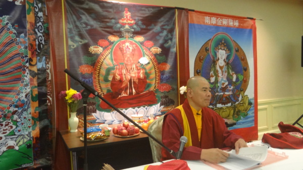 第五式光明坐法:像我昨天講的先跪坐就是和式坐,日本女孩子穿和服的坐姿,行者將左右手往前延伸,手掌壓著地上,身體向前,記得頭要抬高,兩腿打開臀部向後慢慢坐下,前面身體向前,腿打開的時候,屁股就慢慢的向下壓,身體正直雙腿夾緊兩小腿自然向後,腳掌心如能向上最好,身體再慢慢的向上,雙手掌心平伸放於膝蓋上,靜坐調息,觀空做三段法生,也就是觀月輪種子字本尊,三光加被以後,開始將氣引至密輪,也就是吸白光,進紅光下來到你的密輪,這時候你就住氣,提肛,手向前伸,身體慢慢向前下壓,這時候不要吐氣喔,再慢慢起來,重複此動作,開始是慢後來慢慢變快,這時候都是閉氣,當氣不能閉時吐氣,身體再慢慢起來,再慢慢將你的穢氣、污氣、黑氣慢慢的吐出去。(有學員遲到進入教室)歡迎光臨,請進,剛剛大家一致通過,遲到的人罰200,不是200塊喔,談錢就俗氣,是200個掌上壓(上師笑眾人笑),因為為了你的身體著想。