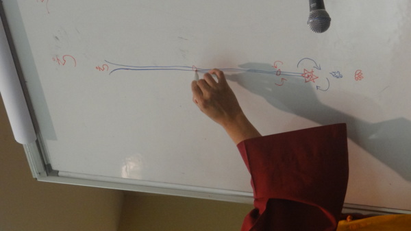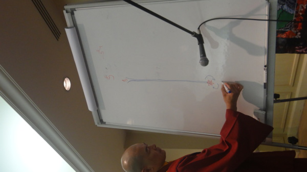包括大恩根本上師,祂也是這樣修,每位密宗行者,不一定要完全修「靈熱法」,但是你至少要修「九節佛風」,就是三三式九節佛風,「九節佛風」這平時是一定要修,要訓練的,讓你的氣跟你的心跟你的意能夠合在一起,這叫心意氣合一,這個就是靈熱法的前行,當它產生了光跟熱,你才有辦法進一步的運用這股氣,從你的中脈一直走到你的頂輪,這時候你才能夠見證光明,見證佛性,佛性由哪裡看?要由你的中央道脈才看的到,沒有經過中央道脈,你見不到你的法性喔,左右脈還不行喔,左白脈是屬於父系的業結氣,右紅脈是屬於母系的業結氣,所以為什麼氣走二脈,前面就是要幫你盡除你累世的習性還有無明,最後使氣入中脈,直接相應法身,你才能夠擁有空性的智慧,也唯有通中脈,才能夠開悟如來,各位,這個就是口訣啦!沒有講,大家就只是開悟喔、氣就是怎樣走,但是方法都錯了,事實上很多行者方法都錯了,要請法呀,要找到你的指導上師才有可能修成,所以修氣修脈修明點,口訣很重要,方法很重要,你的指導上師一定是本身有實修閉關多年,本身是注重傳承,他所有法也一定是由法王直接傳承教授,而指導上師本身也一定是忠於根本上師,凡所交代之事,一定努力去完成,一位真正的行者,要如軍人服從長官,沒有理由!這樣你才能完全真正的得到根本上師傳承,所以修行要找到傳法上師不容易啊。