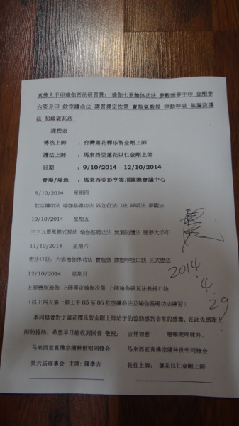 事師九心--行者要每日當思維:這『慈尊如佛的根本金剛上師蓮生法王,猶勝十方一切諸佛。我向您祈請,祈加持我,盡一切生中,以大恭敬依止具格根本金剛上師聖尊蓮生法王。了知如法依止一切功德之本的慈尊上師,您是善樂的根本,我以大恭敬依止您,即使犧牲生命,亦永不背捨』。行者當思惟具格上師的重要,讓自己受控於他。我們大家須知事師九心的重要,行者此生應盡力去行持,時時受持事師九心。應如(一)孝子心:行者應如孝子般,完全奉行上師的諭示,絲毫不違背,上師說什麼就是什麼。(二)堅固金剛心:即使魔類,惡友離間自己與上師,應如金剛杵堅固,永不分離,不受任何外在的影響。(三)要有大地心:凡是上師所賦予的工作及任務都應一一的來完成,應如大地般荷擔一切重責大任。(四)如鐵圍山心:行者依止大恩根本金剛上師而受苦受難時要有『如遭遇困難或問題時』,應不動如山『內心不受干擾,不喪氣』的決心。(五)永遠僕使心:即使上師給你困難的工作,應如國王的僕役以寧靜的心來完成,忠心不二,去把它完成。(六)除穢道心:行者棄絕慢心,應如清道夫,我們永遠是比上師底下,較上師卑下,不敢冒犯,上師是我們的頂上尊,我們是衪永遠的僕役。(七)喜乘心:無論負擔多麼沈重或困難,應如繩索,欣喜地持守上師的工作,縱然是失去了生命也永不背離。(八)如敖犬心:即使上師譏評,激怒或忽視自己,我們依舊應如忠犬,永不報以嗔心,欣喜接受。(九)護法心:應如千里馬,隨時為上師往返,不起煩惱,忠於岡位,隨時隨地守護依止具格大恩根本金剛上師聖尊蓮生法王。