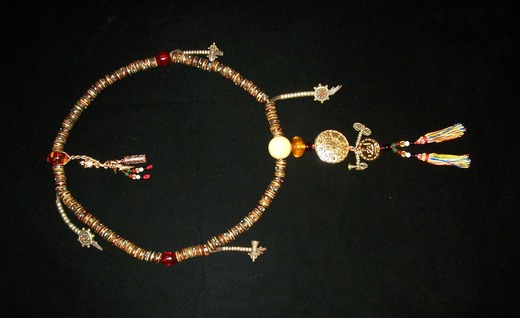如果你細心數了那念珠,不多不少(加上佛陀珠及隔珠),正好是一百一十二粒眉心骨珠或一百一十六粒骨珠。有些眉心骨珠比較特別,只有一百零七顆,為什麼才107!而不是108呢?因為107加上自己剛好是108吉數。每串喇嘛的人骨念珠都有著一串傳奇,在遙遠的某地,在不可知的時空裡,有一些喇嘛把他們的遺骨奉獻出來,再經過不能測量的路途匯集在一起,最後由一位精心的喇嘛琢磨成一串念珠,在這裡面已經有了許多無以細數的因緣了。最最重要的一個因緣是,此時此地它傳到了我們的手上,彷彿能感覺到念珠裡依然溫熱的生命!每當琢磨完一個喇嘛的眉輪骨後,持事喇嘛都會用寶篋盛著保存起來,等到第二位喇嘛圓寂,再同樣磨成一粒念珠。有時候,磨念珠的喇嘛,終其一生也磨不成一串眉輪骨念珠,他就死了,再由另外的喇嘛接替他的工作,把他的眉輪骨也磨成念珠,放在寶篋裡。所以一串人骨念珠,得來是非常的不易,要集合一百一十二位喇嘛的眉骨(連四隔珠),就須經過很長的時間!而光是磨念珠時誦在其中的佛號心咒更是不可計數,人骨念珠象徵破除愚痴妄想的無明,顯露自性清淨的智慧。
